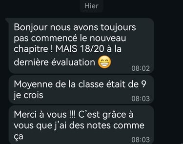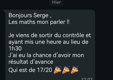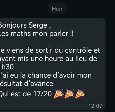 Serge donne des cours à ma fille depuis quelques temps, et que dire... je n’ai jamais vu ma fille aussi motivée. Serge est très pédagogue et il a réussi à lui redonner confiance en elle-même. Nous avons tout de suite décidé que ça allait être lui son mentor pour le passage de son bac cette année. Nous attendons avec impatience ses prochaines notes, mais nous sommes certains que ses cours et sa méthode ne peut être que bénéfique pour notre fille qui était stressée et un peu perdue. Je ne peux en tant que maman que le conseiller car il s’est s’adapter et en plus de ses compétences, il se met dans la position des ados pour un accompagnement optimal.