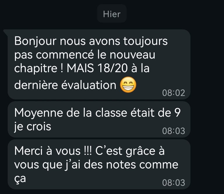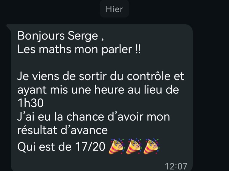 Excellent professeur de mathématiques ! Très pédagogue et à l’écoute, il prend le temps de bien approfondir les notions de base ce qui m’a vraiment permis d’aller plus loin par la suite. Ses explications sont claires et adaptées à mon niveau, et chaque cours m’aide à progresser en confiance. Je recommande fortement!